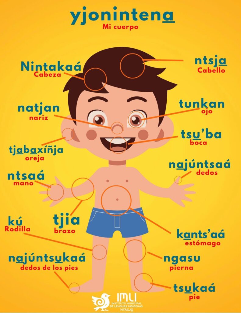 El Instituto Municipal de Lenguas Indígenas (IMLI-ntáxjō )presenta las partes del cuerpo en mazateco de San Felipe Jalapa de Díaz, Oaxaca, Puede ser usado como un recurso didáctico en el aula o bien como un aporte a la revitalización de nuestra lengua originaria.